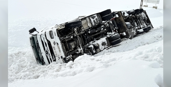 Bitlis'te kar ve tipinin etkili olduğu bir bölgede, kontrolden çıkan bir tır yol kenarına devrildi. Kazada can kaybı veya yaralanma olmazken, araçta hasar meydana geldi.