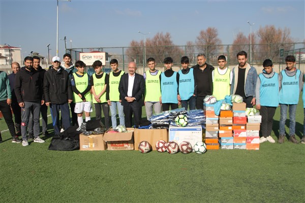 Dernek Başkanı Selahattin Turan, Bulanık İlçe Stadyumu'nda bir araya geldiği sporculara, forma, krampon, konç, eşofman takımı, futbol topu ve çok sayıda antrenman malzemesi hediye etti.