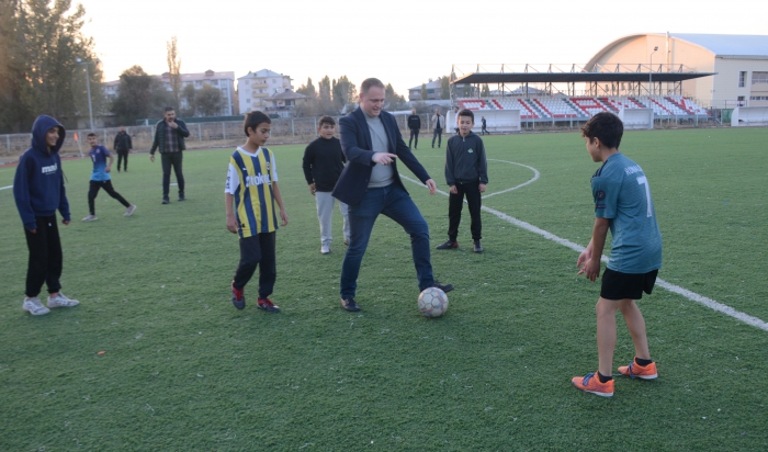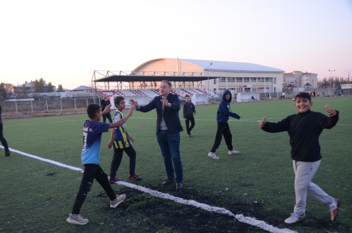 ALPARSLAN DİYARI-Çocukların yoğun ilgisi ve ısrarı üzerine sahaya inen Kaymakam Koşansu, sahada futbol oynayarak keyifli anlar yaşadı.