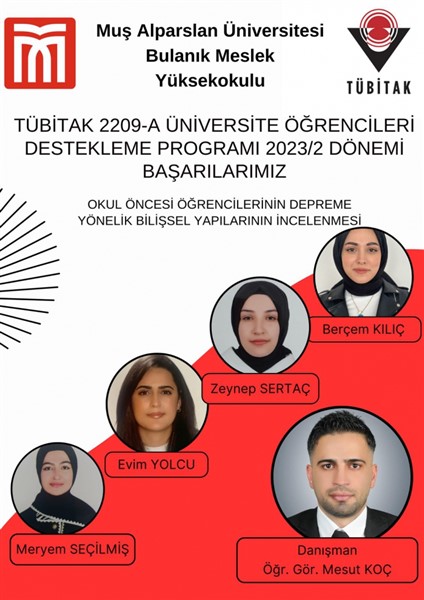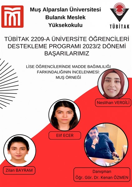 “Hukuk Büro Yönetimi ve Sekreterliği” Programından Öğr. Gör. Dr. Kenan Özmen’in danışmanlığı yaptığı “Lise Öğrencilerinde Madde Bağımlılığı Farkındalığının İncelenmesi: Muş Örneği” isimli projeden aynı bölümden Neslihan Vergili, Elif Ecer, Zilan Bayram, toplumun başat sorunlarından biri olan uyuşturucu madde, sigara kullanımı ve bağımlılığı ile alakalı dirençli, etkili ve önleyici gündem oluşturmak ve toplumu bağımlılıkla alakalı bilinç aşılamak gibi yaygın etkilerini araştıracaklardır. Projenin lise eğitimine devam eden gençlerin bilinçlendirilmesi ve bağımlılıkla mücadele açısından önemli bir potansiyele sahip olduğu düşünülmektedir.”