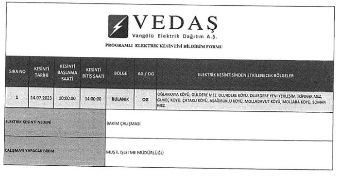 VEDAŞ Muş İl İşletme Müdürlüğü Bulanık’ta bakım çalışması yapacak. Buna göre bazı köylerde geçici olarak elektrik kesintisi yaşanacak.