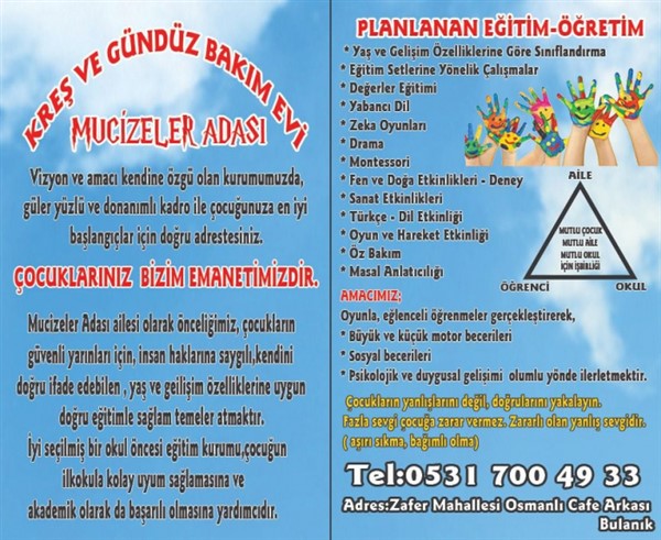 Mucizeler Adası Kreş ve Gündüz Bakımevi tarafından yapılan açıklamada şu ifadelere yer verildi: “Tecrübeli ve uzman kadro ile profesyonel bir hizmet sunumuna hazırlanmaya başlamıştır. Çocukların bakımları yanı sıra alacağı eğitimlerde de çocuk merkezli düşünüldüğünü ve branş derslerine de yer verdiklerini belirterek çocukların eğlenirken öğrenecekler. Kurumda çocukların güvenliği, sağlığı ve eğitimlerinin en ince ayrıntısına kadar düşünüldü.
