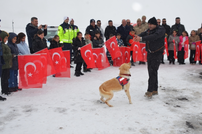 Jandarmanın eğitimli köpekleriyle yapılan gösteriyi izleyen çocukların, zırhlı araçlara bindirilerek gönüllerince eğlenmeleri sağlandı.