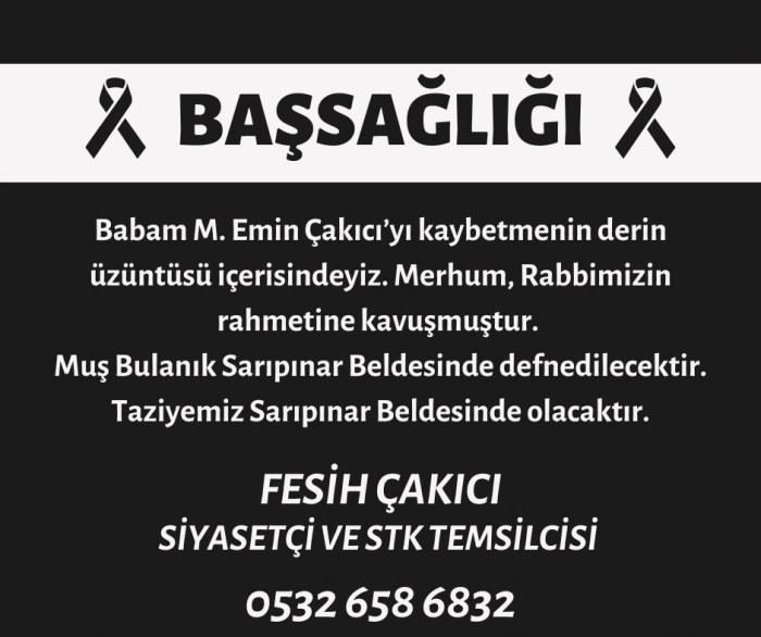 ALPARSLAN DİYARI- Muş Bulanıklı siyasetçi ve sivil toplum kuruluşlarında yöneticilik yapan Fesih Çakıcı babasını kaybetti.