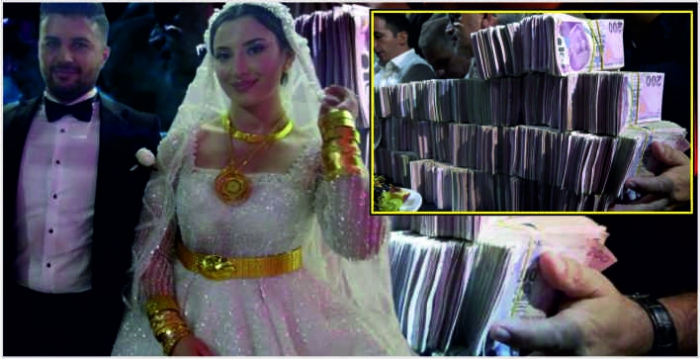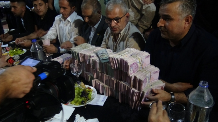 ALPARSLAN DİYARI- Celali aşiretine mensup Özbağ ailesinin oğlu Serhat ile Bitirgiç ailesinin kızı Şevval’in düğününde, geline tam 3 kilogram altın, damada ise 4 milyon 50 bin TL para takıldı.