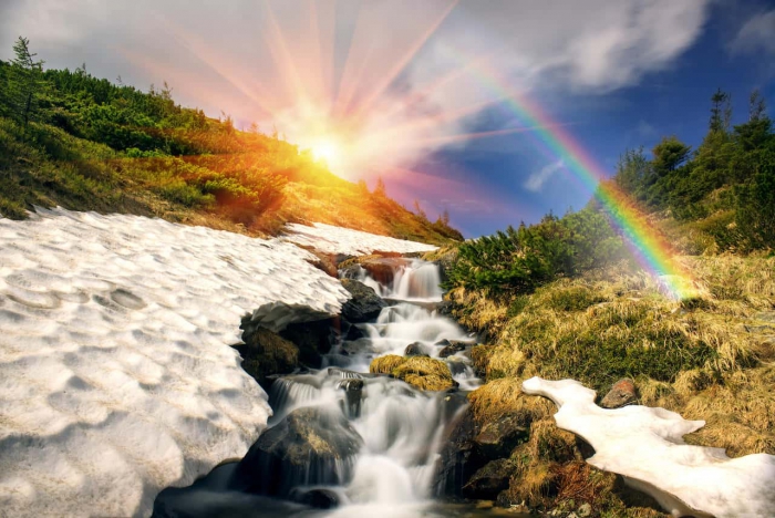 ortasında şelale akan ormanlık alanın üzerinde görülen gökkuşağı ve eriyen karlar