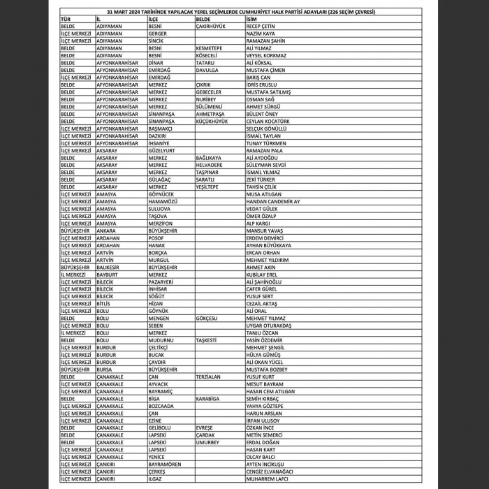 İŞTE CHP'NİN AÇIKLANAN BELEDİYE BAŞKAN ADAYLARI