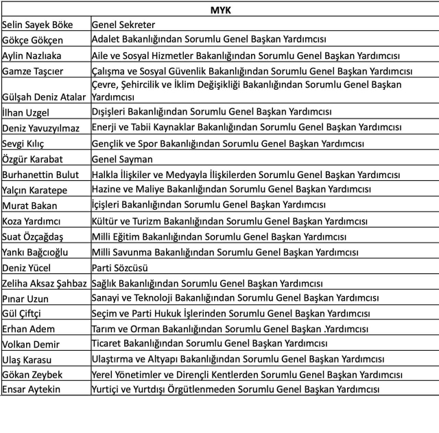 Önceki MYK'dan üç isim yeni MYK'da yer aldı. Bu isimler Gökçe Gökçen, Selin Sayek Böke ve Aylin Nazlıaka oldu. Ayrıca, CHP kurultayında Oğuz Kaan Salıcı'nın listesinden Parti Meclisi'ne giren isimlerin de yeni MYK'da görev alması dikkatlerden kaçmadı.