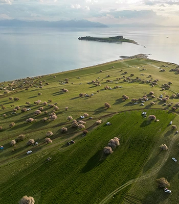 ALPARSLAN DİYARI- Van Gölü'nün kuzeydoğusunda yer alan yarımada, ağaçların çiçek açması ve doğanın canlanmasıyla seyrine doyum olmayan manzaraya büründü.