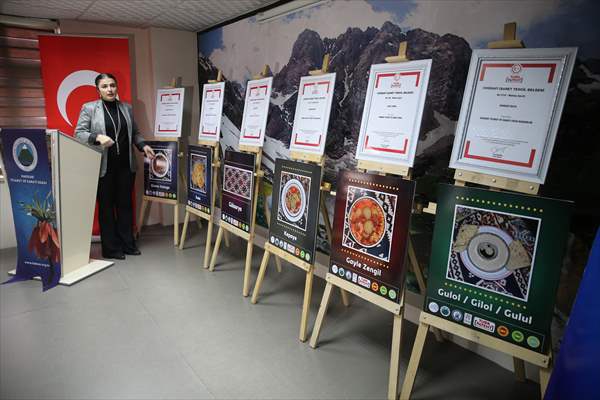 ALPARSLAN DİYARI- Hakkari Ticaret ve Sanayi Odasında düzenlenen tanıtım toplantısında Türkiye Odalar ve Borsalar Birliği (TOBB) Kadın Girişimciler Kurulu Doğu Anadolu Bölge Başkanı Sevda Keskin, katılımcılara, tescillenen Gayle Zengıl, Girara Huluga, Gulol, Kadesi ve Kepaye yemekleri ile Hakkari kilimi hakkında bilgi verdi.