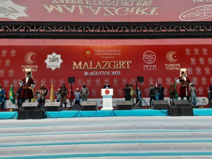 “Hepiniz en kalbi duygularımla, hasretle muhabbetle selamlıyorum. Anadolu'yu bize vatan haline getiren şehitlerimizi, gazilerimizi rahmetle şükranla yad ediyorum. Şu hakikat asla unutulmamalıdır ki, Malazgirt sıradan bir savaş sıradan bir zafer değildir.”