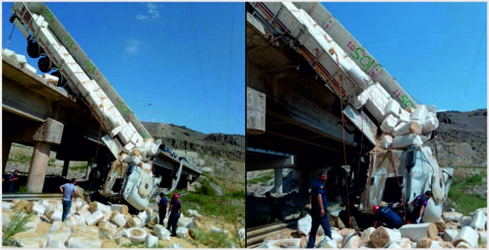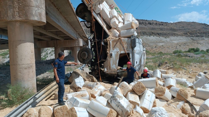 ALPARSLAN DİYARI- Yakup Ç. idaresindeki 80 ADJ 074 plakalı saman balyası yüklü tır, Yazıhan ilçesine bağlı Akyazı Mahallesi Sarsap Tüneli çıkışındaki köprüde çelik bariyerleri aşarak devrildi.