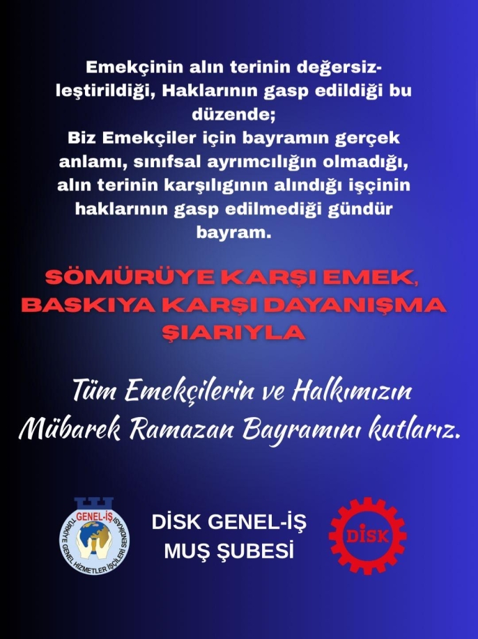 DİSK Genel-İş Muş Şubesi, açıklamasının sonunda tüm emekçilerin ve vatandaşların Ramazan Bayramı’nı kutladı.