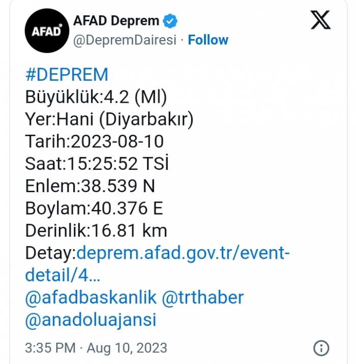 Afet ve Acil Durum Yönetimi Başkanlığının (AFAD) internet sitesinde yer alan bilgiye göre, Diyarbakır'da saat 15.25'te 4,2 büyüklüğünde deprem kaydedildi.