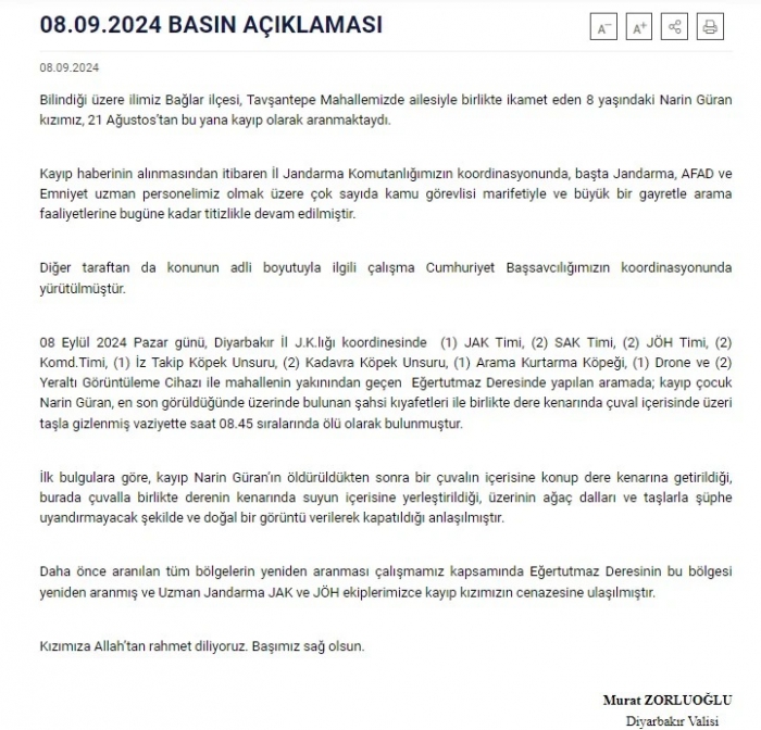 Küçük Narin'in cesedinin bulunması üzerine tartışmalar sürerken Diyarbakır Valiliği arama çalışmaları hakkında kapsamlı bir açıklama Diyarbakır Valiliği resmi internet sitesinden yayınlandı.