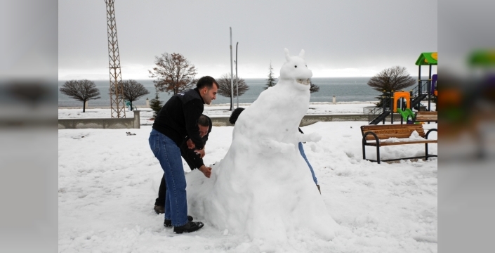 Van'ın Erçiş ilçesinde bir iş yeri çalışanları, yoğun kar yağışının ardından biriken karı eğlenceye dönüştürdü. Çalışanlar, iş yerlerinin bahçesine kardan 'Van Gölü Canavarı' yaptı. Kafe çalışanı Berat Durmaz, karın tadını doyasıya çıkardıklarını belirterek, 'Van'ımızın ve Van Gölü'müzün simgesi olan canavarı kardan yaptık. İşletmemizin önüne güzel renk kattı.' dedi.
