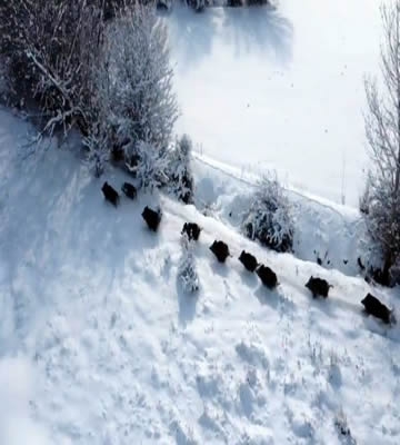 İlçede kar yağışıyla beyaza bürünen doğada yiyecek arayan yaban domuzları, cep telefonuyla kaydedildi.