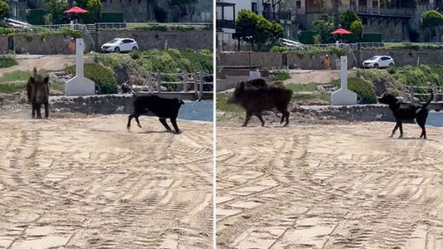 Plaja inen domuzları bir köpek kovmak isterken domuz tarafından saldırıya uğraması da saniye saniye kaydedildi.