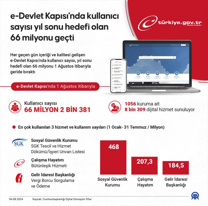 Kullanıcı sayısı 1 Ağustos itibarıyla 66 milyon 2 bin 381'e ulaşan e-Devlet Kapısı'nda, yıl sonu hedefi olan 66 milyon kullanıcı sayısı aşılmış oldu.