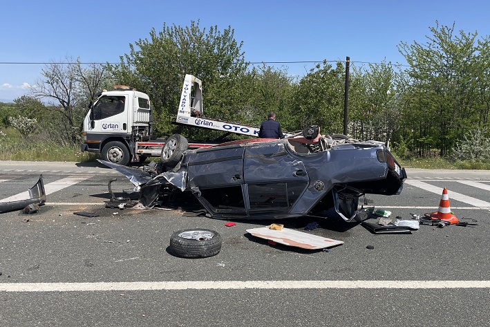 Çarpışmanın etkisiyle hafif ticari araç şarampole, otomobil ise karşı şeride geçerek yola devrildi.