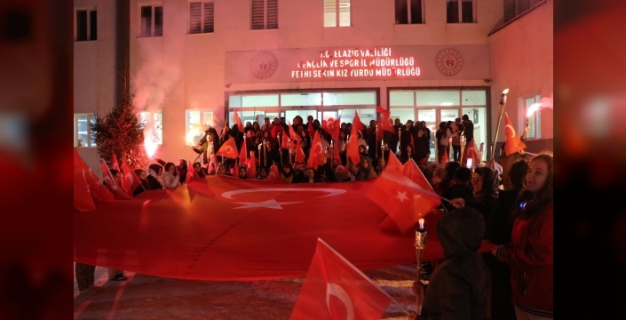 Gençlik ve Spor Bakanlığına bağlı Şehit Fethi Sekin Kız Öğrenci Yurdu'nda kalan öğrenciler, yurt bahçesinde toplanarak Türk bayrağı açtı, meşale yaktı ve İstiklal Marşı'nı okudu. Bu anlamlı gösteri, bayrağa yapılan saldırıya karşı bir dayanışma mesajı niteliğindeydi.