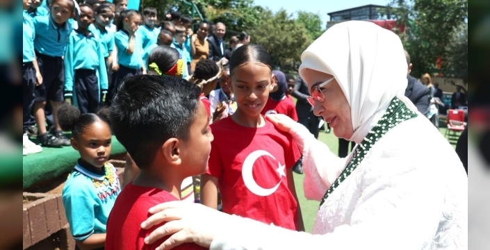 Emine Erdoğan, G20 Liderler Zirvesi nedeniyle bulunduğu Güney Afrika'da Uluslararası Johannesburg Maarif Okulu'nu ziyaret etti. Okula gelişinde Türkiye Maarif Vakfı Güney Afrika Ülke Temsilcisi Abdullah Cevizci ve öğretmenler tarafından karşılanan Erdoğan'a iki öğrenci çiçek takdim etti.