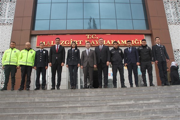 Malazgirt İlçe Emniyet Müdürü Serhan Türk ile beraberindeki polisler, Türk Polis Teşkilatının 177. kuruluş yıldönümü nedeniyle Kaymakam Yiğit Yaşar Demirer’i makamında ziyaret etti.