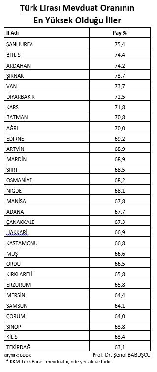 TL mevduat oranı en yüksek olan illerde ise ilk sırada yüzde 75,4’le Şanlıurfa gelirken, Şanlıurfa’yı yüzde 74,4’le Bitlis, yüzde 74,2’yle Ardahan takip etti.