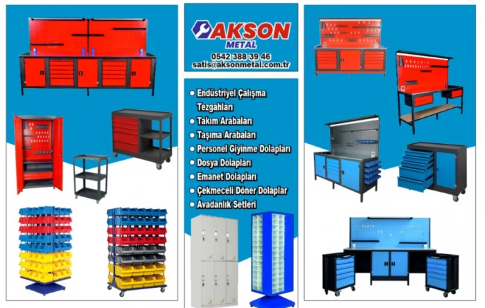 Akson Metal'in geniş ürün yelpazesi, farklı sektörlerin ihtiyaçlarına cevap verebilecek çeşitlilikte. Endüstriyel çalışma tezgahları, takım arabaları, taşıma arabaları, personel giyme dolapları, dosya dolapları, emanet dolapları, çekmeceli döner dolaplar ve avadanlık setleri gibi ürünler, şirketin ürün portföyünde yer alıyor.