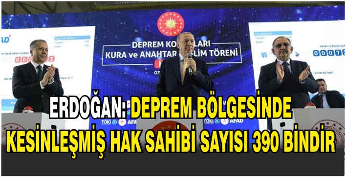 Erdoğan, “Vatandaşlarımız müsterih olsun. Devletlerine ve bize güvensin. Kimsenin hakkı yerde kalmayacak, kimse mağdur olmayacak. Amacımız, takip eden dönemde de her ay 15-20 bin konut ve köy evini hak sahipleriyle buluşturmaktır. Temel atmasının üzerinden 1 yıl geçmeden inşaatları bitirme sözümüzü önemli ölçüde yerine getirerek, yıl sonuna kadar 200 bin evi teslim etmiş olacağız. İnşallah 2 ay içinde deprem bölgesi genelinde 75 bin konutun teslimini bitireceğiz. Hedeflerimize doğru yürürken deprem, terör, ekonomik tuzaklar başta önümüzdeki muhtemel tehditleri de birer birer bertaraf etme kararlılığındayız” dedi.