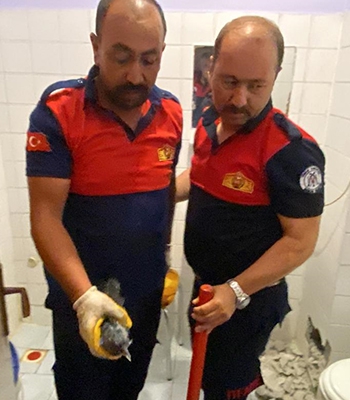 ALPARSLAN DİYARI- Kent merkezindeki Mimar Sinan Mahallesi 1199 Sokak'ta bir apartman dairesinin banyo havalandırmasından ses duyan vatadaşlar, durumu 112 Acil Çağrı Merkezine bildirildi. Eve gelen Erzincan Belediyesi itfaiye ekipleri, banyonun havalandırma boşluğunun alt kısmını matkap ve çekiç yardımıyla kırdı.