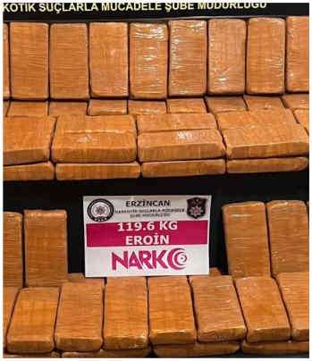 Yapılan aramada kamyonun koltuklarının içine gizlenmiş dört çuvalda 119 kilo 600 gram eroin ele geçirildi.