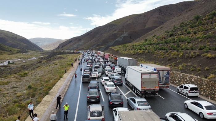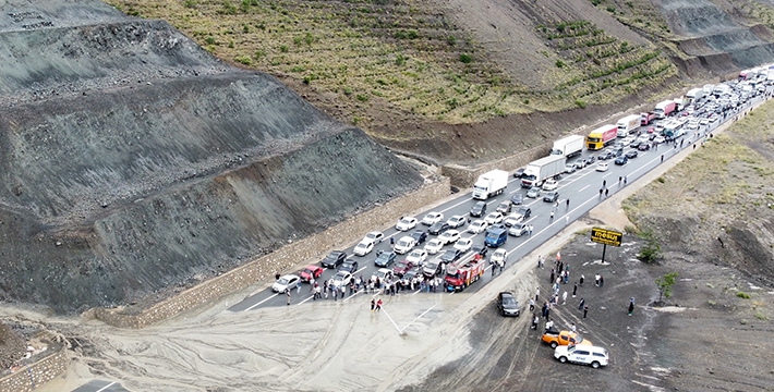Uzun araç kuyruğunun oluştuğu yolda, kara yolları ekiplerinin temizlik çalışması sürüyor.