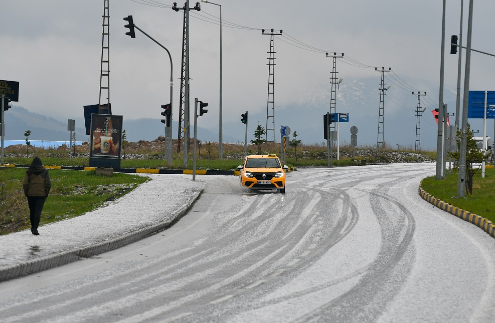 Kısa sürede etkili olan ve çevreyi beyaza bürüyen dolu nedeniyle arabalar yollarda güçlükle ilerleyebildi.