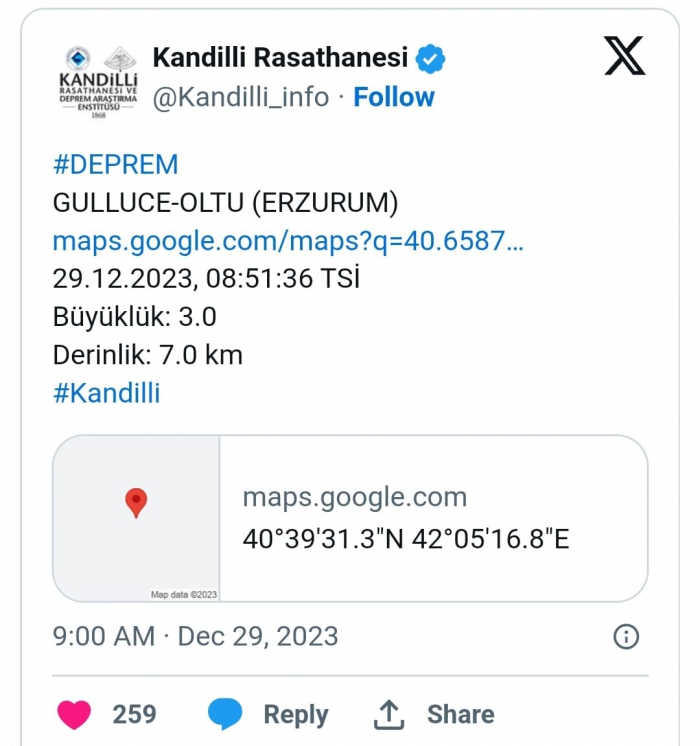 ALPARSLAN DİYARI- Kandilli Rasathanesi, Erzurum'un Oltu ilçesinde 3.0 şiddetinde meydana gelen depremin derinliğinin 7.0 olduğunu paylaştı.