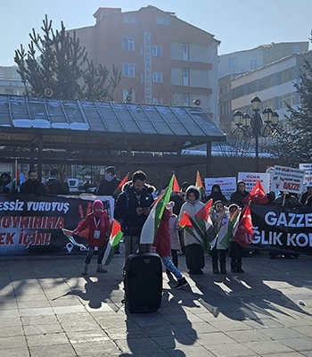 ALPARSLAN DİYARI- Kent merkezindeki Lalapaşa Camisi'nin önünde bir araya gelen doktorlar, tıp fakültesi öğrencileri ve sağlık çalışanları, Türk, Filistin ile Doğu Türkistan bayrakları eşliğinde taşıdıkları döviz ve pankartlarla Yakutiye Medresesi'ne kadar yürüdü.