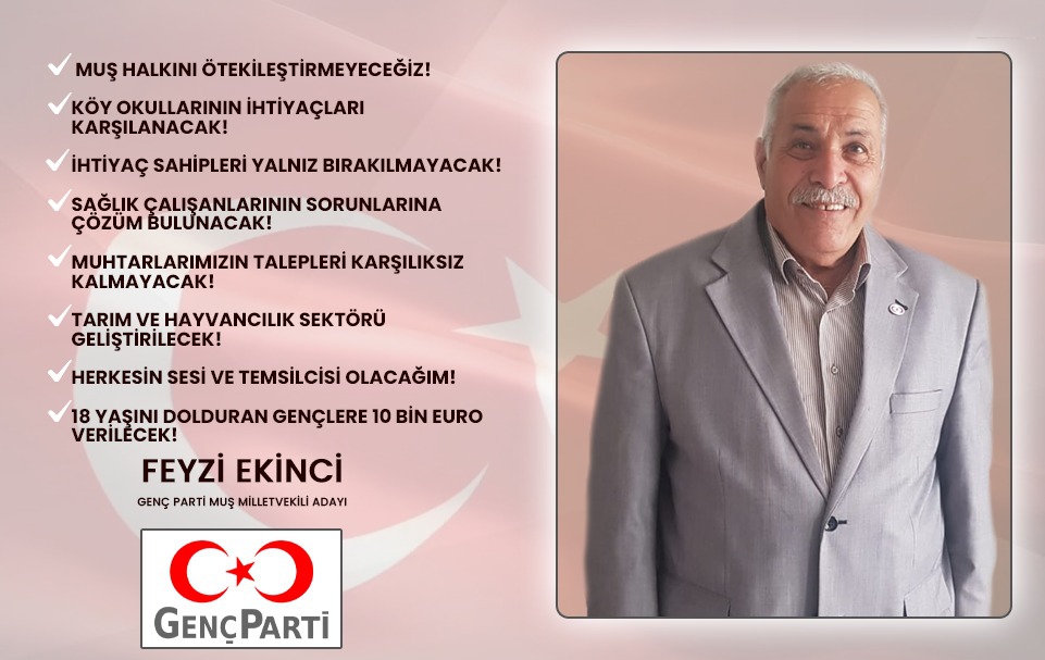 Muş'ta sürdürdüğü faaliyetlerle adından bir çok kez söz ettiren ilin önde gelen Ekinci ailesinden Feyzi Ekinci Genç Parti'den 1. sırada Milletvekili Adayı olduğunu duyurdu. İl genelinde bir çok aileyle yakından ilgilenerek dertlerine derman olan ve aynı zamanda kanaat önderi Feyzi Ekinci, 14 Mayıs seçimleri için sahada faaliyetlerini sürdürmeye devam ediyor. Aynı zamanda emekli devlet memuru olduğunu belirten Ekinci, "Muş'ta faal bir şekilde çalışıyoruz. Seçmenlerimiz ve halkımız çok güzel ilgi ve alaka gösteriyorlar. Çalışmalarımıza aralıksız devam ederken, sadece seçim sürecinde değil her an hemşehrilerimizin yanında olacağız." dedi.