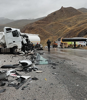 ALPARSLAN DİYARI- Hakkari-Van kara yolunun Sarıtaş köyü yakınlarında sürücülerinin ismi henüz öğrenilemeyen 34 SD 0721 plakalı otobüs ile 65 ABA 951 plakalı yakıt tankeri çarpıştı.