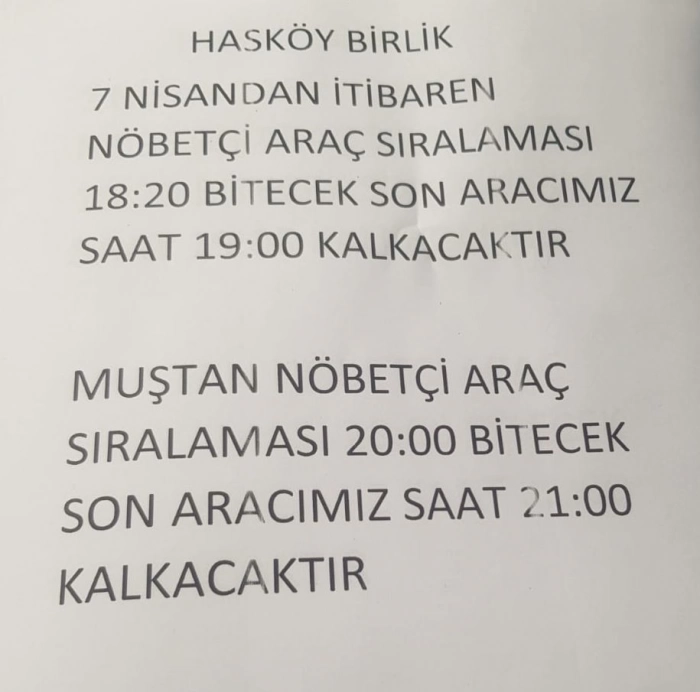 ALPARSLAN DİYARI-Hasköy Dolmuşçular Kooperatifi tarafından yapılan açıklamaya göre, 7 Nisan itibarıyla yeni sefer saatleri uygulanacak.