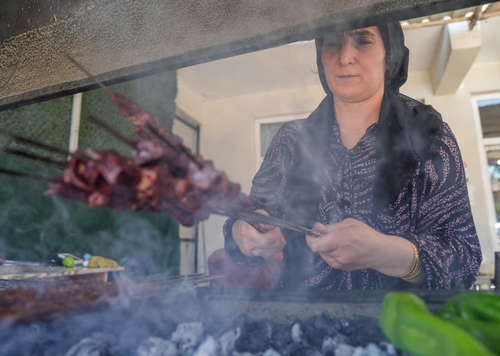 Elazığ'da Maden ilçesinde Hazar Gölü kıyısında 22 yıldır ailesiyle restoran işleten 5 çocuk annesi Perihan Kurt, müşterileri için ocağın başına geçerek başta ciğer olmak üzere kebap çeşitleri hazırlıyor.