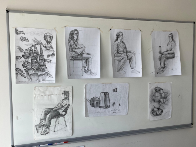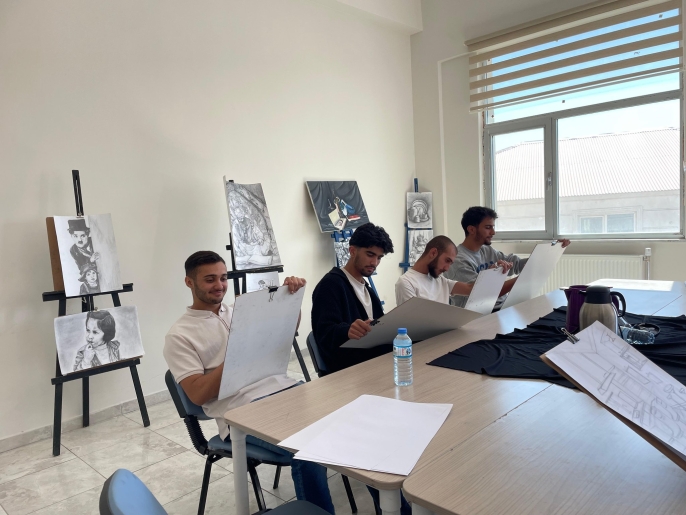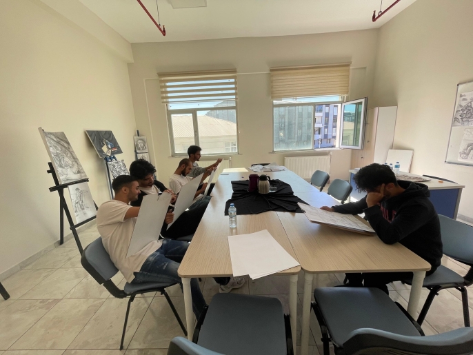 Karakalem eğitiminde bir araya gelen gençler, büyük bir dikkat ve tutkuyla çizimlerine odaklanıyor. Ellerinde şövaleler, önlerinde büyük kâğıtlar ve masada duran karakalem eskizleriyle öğrenciler, portre ve detaylı çizim tekniklerini öğreniyorlar. Atölye ortamı, beyaz duvarları, geniş pencereleri ve öğrencilerin sanat eserleriyle dolup taşan şövaleleriyle son derece verimli ve ilham verici.
