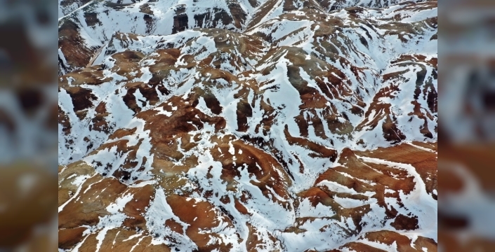 Iğdır'ın Tuzluca ilçesinde yer alan Gökkuşağı Tepeleri, bölgede etkili olan kar yağışının ardından beyaz bir örtüyle kaplandı. Bu doğa olayı, tepelerin bilinen renk cümbüşüne yepyeni bir görsel şölen ekledi.