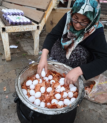 Köylerde kazanlarda soğan kabuğu ile pişirilen ve kırmızımsı bir renk alan yumurtalar, bayram ziyaretine gelen gençlere ve çocuklara hediye ediliyor.