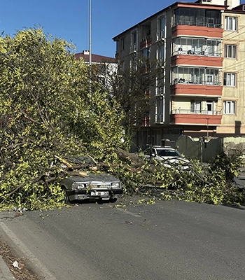ALPARSLAN DİYARI- Rüzgarın etkili olduğu kentte, sürücüsünün ismi öğrenilemeyen 76 AN 349 plakalı otomobil İlham Aliyev Caddesi'nde seyir halindeyken üzerine refüjdeki ağaç devrildi.
