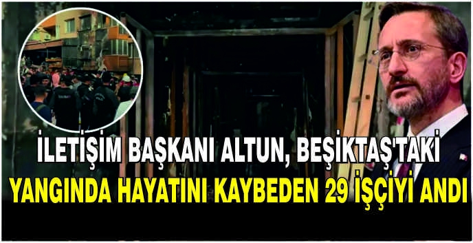 ALPARSLAN DİYARI- İletişim Başkanı Altun, sosyal medya hesabından yaptığı paylaşımda, "Beşiktaş Gayrettepe'de gece kulübünde çıkan yangında hayatını kaybeden 29 emekçi kardeşimizi rahmet ve saygıyla anıyoruz" ifadelerini kullandı.