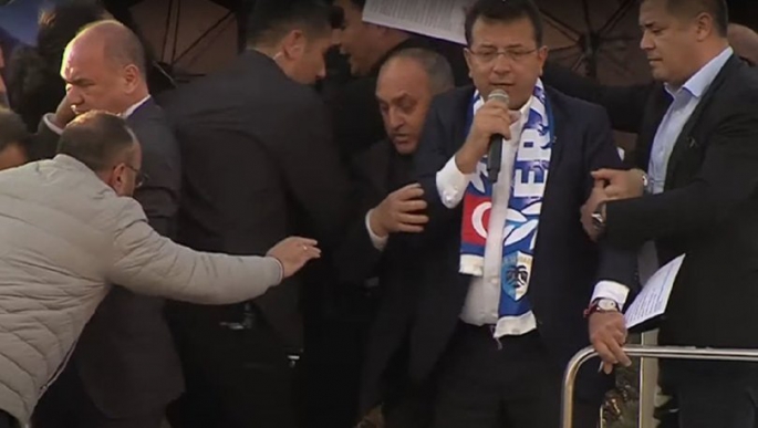 İmamoğlu'nun bulunduğu otobüs, Havuzbaşı Meydanı'ndaki program alanına girdiği sırada bir grup tarafından otobüse yabancı cisimler atıldı.