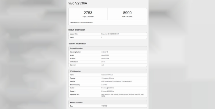 Geekbench veritabanında V2536A model numarasıyla listelenen iQOO Z11 Turbo olduğu düşünülen cihaz, tek çekirdek testinden 2.753, çoklu çekirdek testinden ise 8.990 puan almayı başardı. Bu sonuçlar, cihazın kalbinde yer alacak Snapdragon 8 Gen 5 yonga setinin üstün gücünü ortaya koyuyor. Test ayrıca, cihazın 16 GB RAM ve en güncel işletim sistemi olan Android 16 ile geleceğini de doğruluyor.