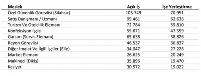 En çok açık iş “Özel Güvenlik Görevlisi (Silahsız), Satış Danışmanı/Uzmanı ve Turizm ve Otelcilik Elemanı” mesleklerinde oluştu.