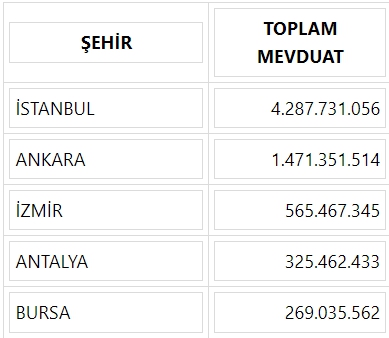 Tasarruflar konusunda en yüksek mevduata sahip olan 5 şehir trilyonlarca liralık mevduatıyla ön plana çıkıyor. Bu iller arasında İstanbul, Ankara, İzmir, Antalya ve Bursa yer aldı.