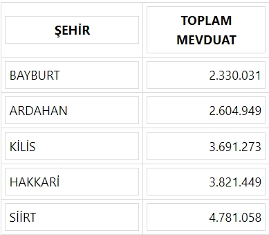 Bankalarda en düşük mevduat tutan illerin arasında ise Bayburt başı çekti. Bayburt'u sırasıyla Ardahan, Kilis, Hakkari ve Siirt takip etti.
